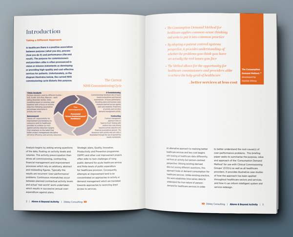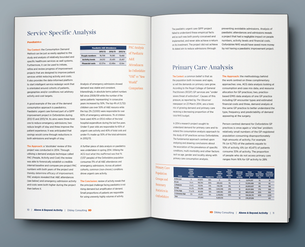 Design for a 16 page business report comprising text, infographics and tables of data.